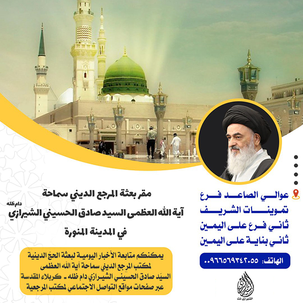مع قرب أيام مناسك الحجّ ووصول ضيوف الرحمن وحجّاج بيت الله الحرام إلى المدينة المنوّرة، وصل أعضاء بعثة مكتب المرجع الديني سماحة آية الله العظمى السيّد صادق الحسيني الشيرازي دام ظله إلى المدينة المنوّرة، ليشرعوا بفعالياتها. وقد بدأت البعثة يومها الأول بجلسة تداولية لبحث آلية العمل في مقرها وكذا تنسيق الأعمال للسعي إلى خدمة زوار المدينة المنورة والإجابة عن مسائلهم الشرعية وقضاء حوائجهم. حيث ان من فعاليات بعثة الحج الدينية لمكتب سماحة المرجع الشيرازي دام ظله استقبال العلماء ووكلاء وممثلي مراجع التقليد الاعلام، وعامة حجاج بيت الله الحرام والاجابة على مختلف الاسئلة الشرعية والعقائدية للحجاج، واقامة جلسات الحوار والمعرفة المختلفة، اضافة الى عقد ندوات ثقافية وعلمية وغيرها. يذكر ان مقر بعثة سماحة المرجع الشيرازي دام ظله في العنوان التالي: منطقة عوالي الصاعد، فرع تموينات الشريف، الفرع الثاني من جهة اليمين، البناية الثانية وعلى جهة اليمين كذلك. هاتف البعثة: 00966569342055