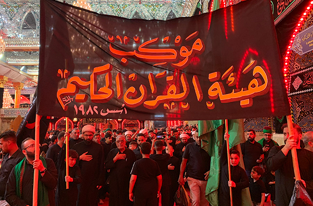 بمناسبة مرور سبعة أَيام من ذكرى واقعة الطفِّ الدامية وشهادة المولى سبط رسول الله ـ صلى الله عليه واله ـ وسيد شباب أهل الجنَّة الإمام الحسين عليه السلام، وأهل بيته، وصحبه الأبرار، لهذا العام 1446 هجرية، نظّمت هيأة القرآن الحكيم والأمور الخيريَّة في ليلة السابع مسيرة عزاء شارك فيها وفد من مكتب سماحة المرجع الشيرازي دام ظله مع كوكبة من الفضلاء، وطلبة العلم، وخطباء المنبر الحسيني، وقرّاء الكتاب العزيز، فضلاً عن المؤمنين. مسيرة العزاء انطلقت بعد أداءِ صلاتَي المغرب والعشاء من مرقد العلَّامة الشيخ أَحمد بن فهد الحلي ـ رحمه الله ـ في مدينة كربلاء المقدَّسة متوجهةً إلى المرقدين الطاهرين الحسيني والعباسي، عبر شارع قبلة الإمام الحسين عليه السلام، ومنطقة ما بين الحرمين الشريفين، ليختم العزاء مسيره في الصحن الحسيني المطَّهر بمراسم خاصَّة. العزاء تميز بأبيات الرثاء الحزين المعبِّر عن عظم المصاب ولوعته، وكذا الولاء لأهل بيت النبوة ـ صلوات الله وسلامه عليهم ـ فمنها أبيات الشريف الرضي قدِّسَ سِرُّهُ: كربلاء لازلت كرباً وبلا مـالقي عندك آل المصطفى كم على تربك لمَّا صرِّعوا من دم سال ومن دمع جرى والجدير بالذكر أنَّ موكب هيأة القرآن الحكيم من المواكب المتميزة في المدينة المقدَّسة تأسس عام 1402 هجرية الموافق 1982م، منبثقاً عن هيأة القرآن الحكيم الهادفة إلى تعليم القرآن الكريم تلاوة وأحكاماً وتجويداً عبر تأسيس دورات خاصَّة على طول العام ويبلغ عملها الذروة في شهر رمضان المبارك.