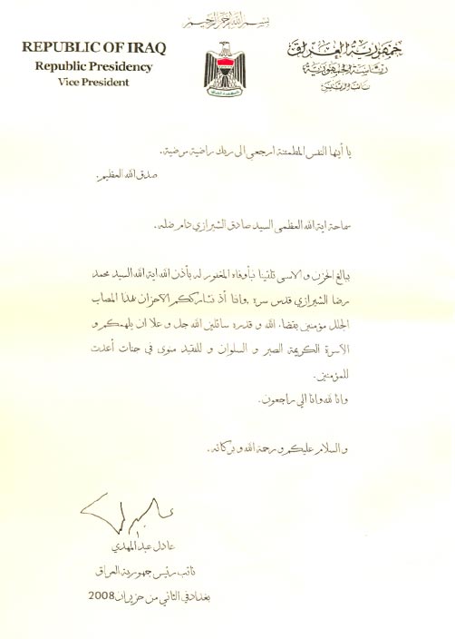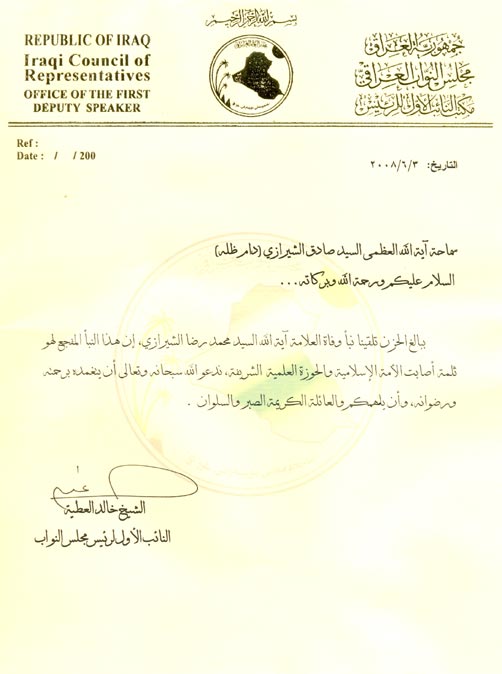 نائب رئيس الجمهورية ونائب رئيس مجلس النوابيعزيان سماحة المرجع الشيرازي دام ظله ويبعثان برقيتا تعزية ومواساة:. بمناسبة رحيل فقيد العلم والورع والتقوى سماحة آية الله السيد محمد رضا الحسيني الشيرازي قدس سره بعث الدكتور عادل عبد المهدي النائب الأول لرئيس الجمهورية والشيخ خالد العطية النائب الأول لرئيس مجلس النواب العراقي برقيتا تعزية ومواساة إلى سماحة آية الله العظمى السيِّد صادق الحُسيني الشَّيرازي (دام ظلُّه) وفيما يلي برقيتا التعزية: